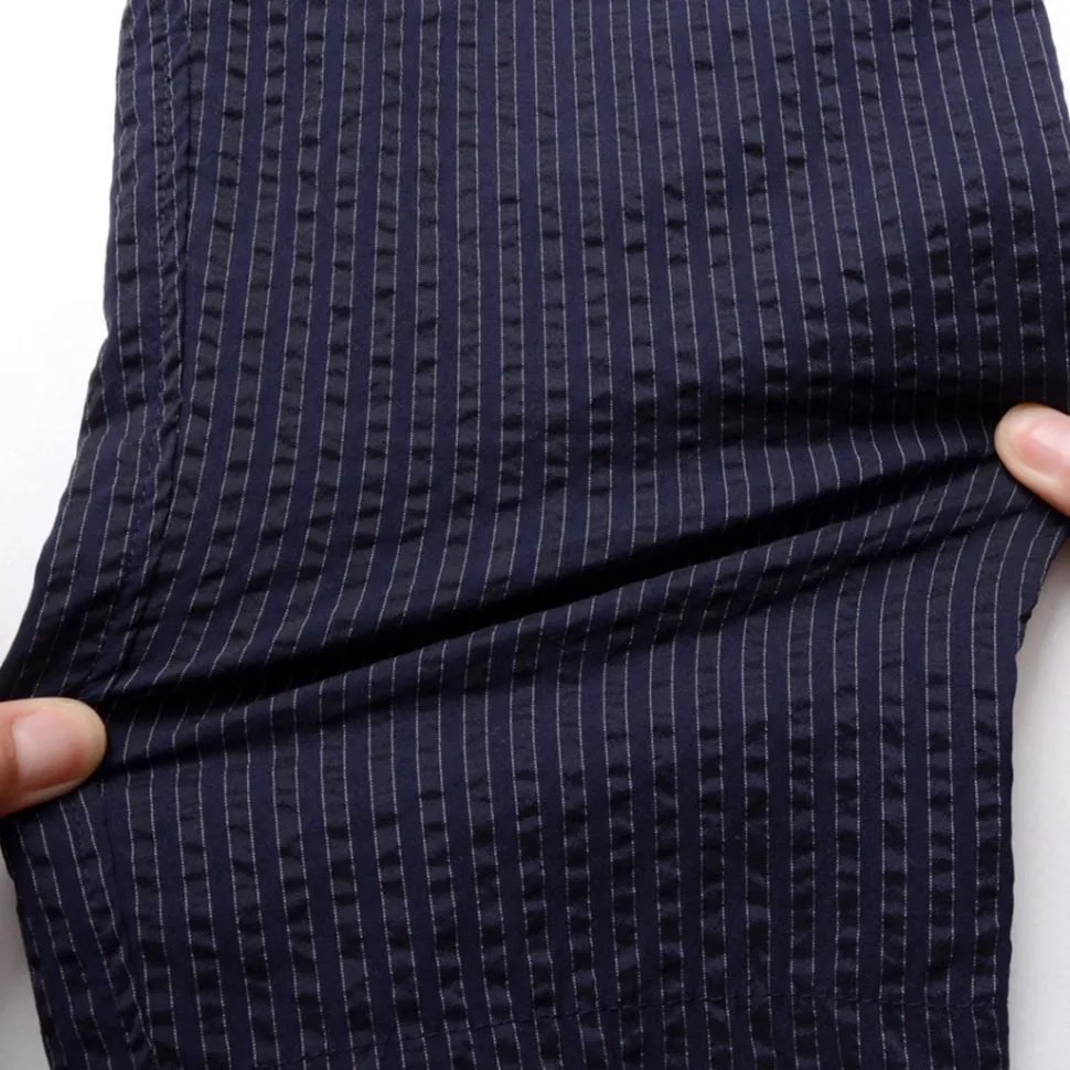 Seersucker trousers woven with ‘COOLMAX yarn’ for cool summer wear. The simple yet chic design includes a subtle stripe pattern.
