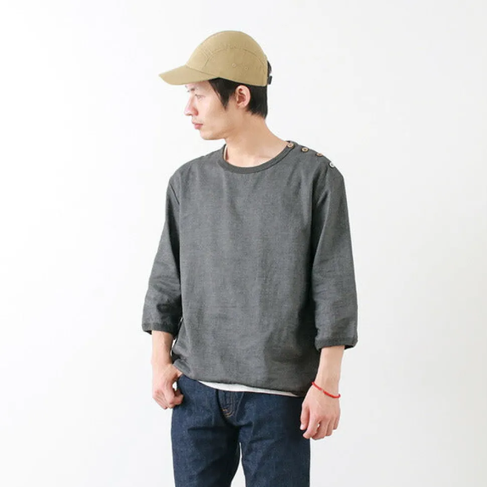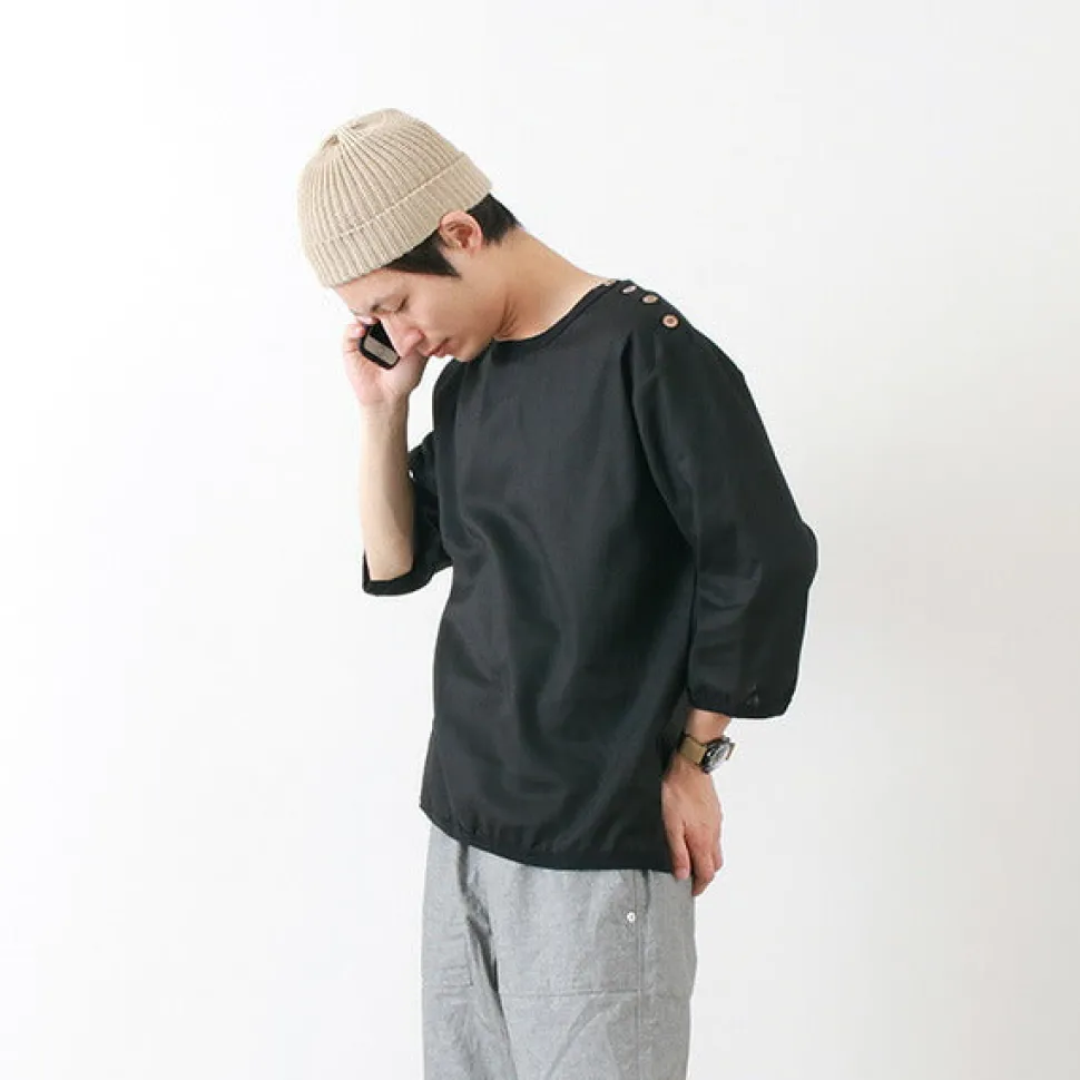 A mature piece of clothing in a fine linen fabricThis is a woven basque shirt with 7-minute sleeves made of linen canvas. It has a cool and light feel, which is unique to the quality of linen. The slightly loose fit allows the breeze to flow through the fabric, creating a relaxed and comfortable garment that is perfect for hot summer days. Linen canvas with excellent water absorbency, wicking properties and durability Linen canvas fabric with a good sheen and an elegant, luxurious feel. Linen is highly absorbent and wicks away moisture, making it ideal for hot and humid weather. The use of canvas adds extra durability. The canvas is thin and very breathable, whereas you might imagine a thicker canvas.