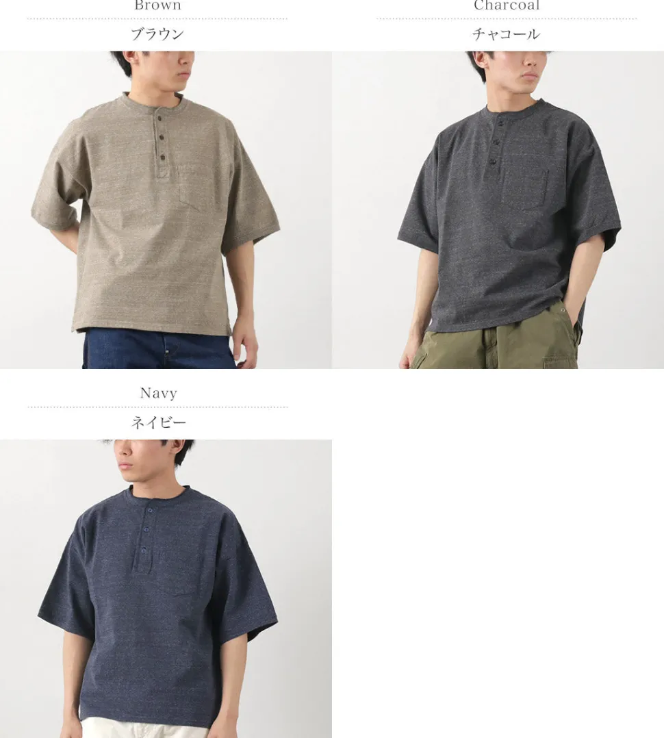 The neckline is an orthodox three-button henley neck. Vintage-style cat-eye buttons are used for the buttons.