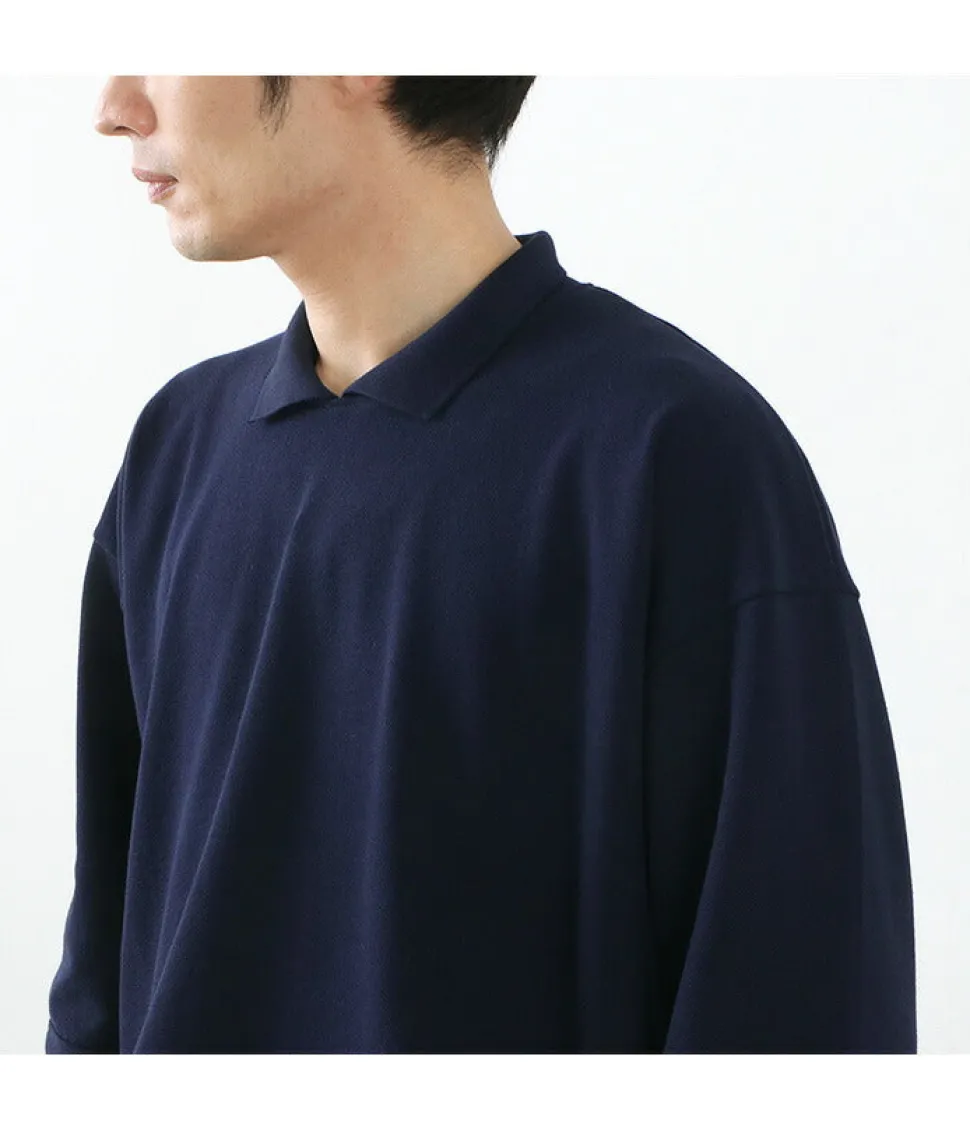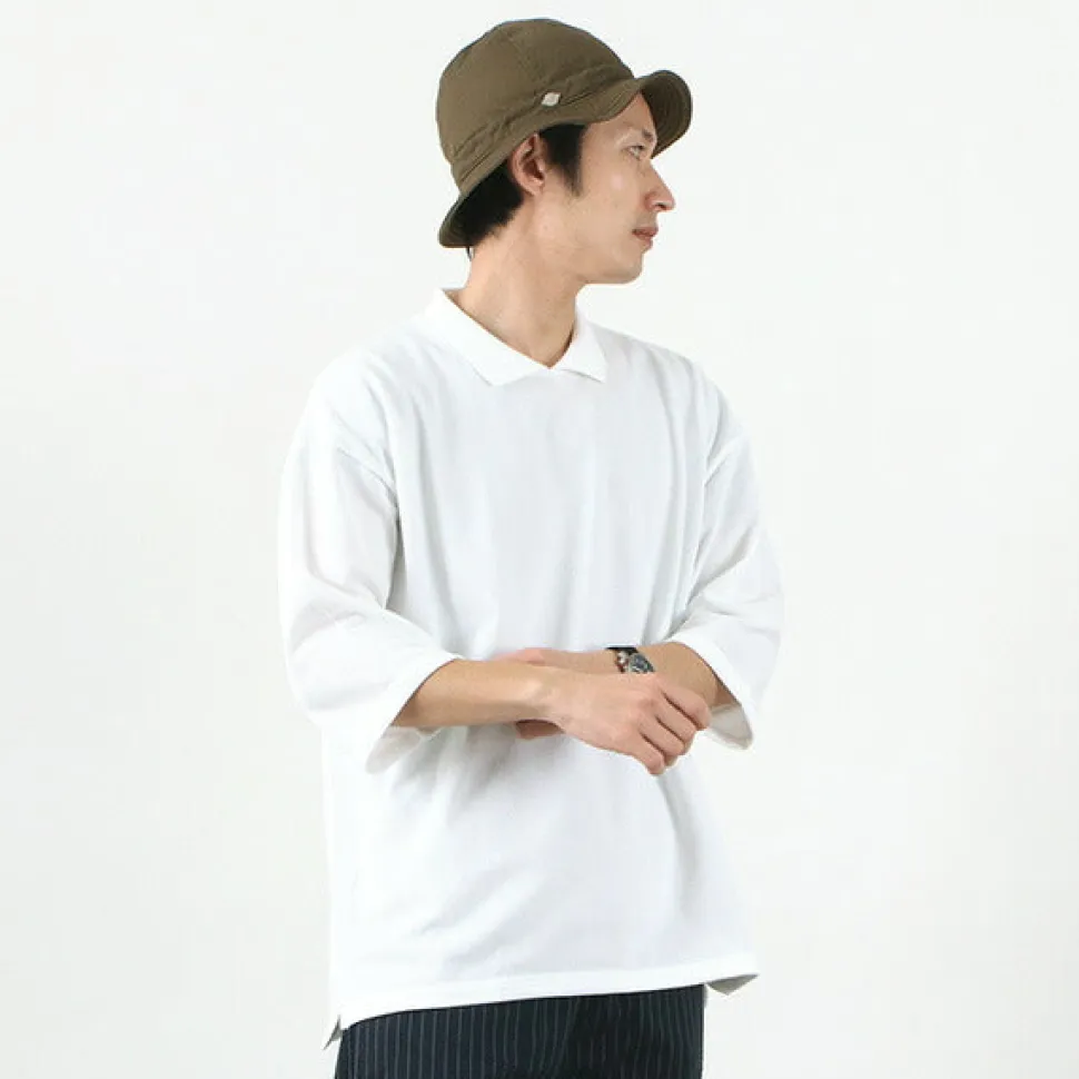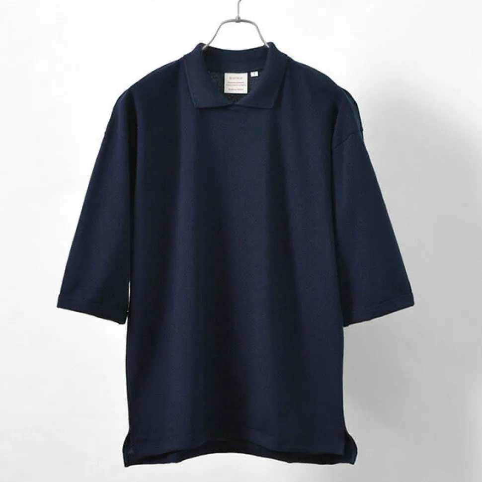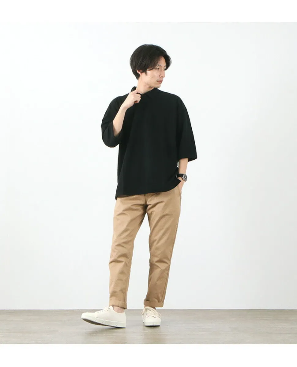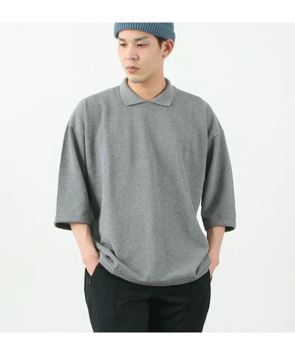 A big silhouette polo collar T-shirt with a generous body width. The material used is cotton pique (Kanoko weave), which has a light and dry texture. It is comfortable to wear even in midsummer.