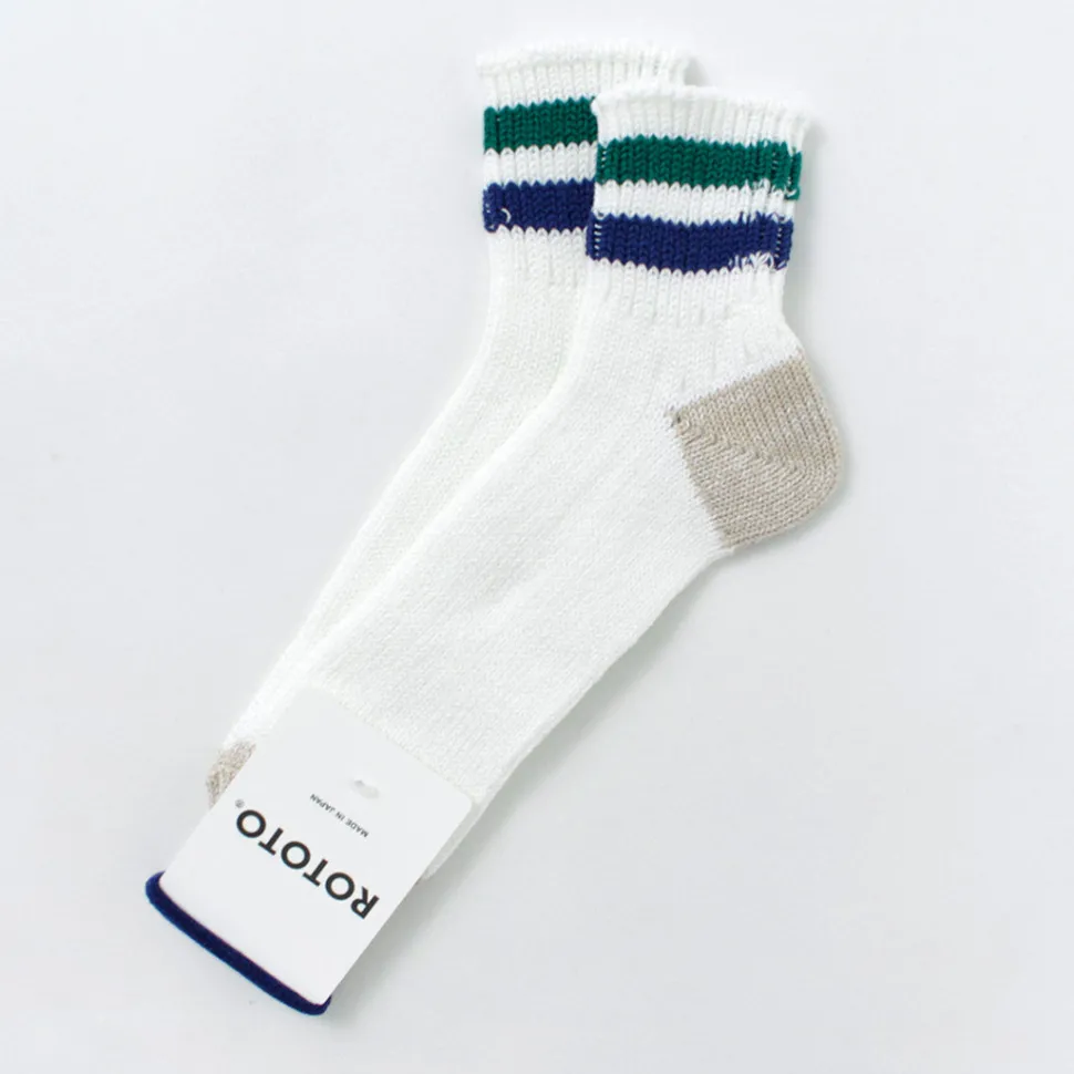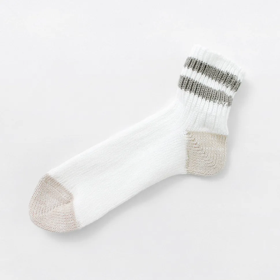 These 2-stripe socks feature a colouring reminiscent of school colours. Mixed organic cotton and linen yarns are rib-knitted using an old-style low-gauge knitting machine.