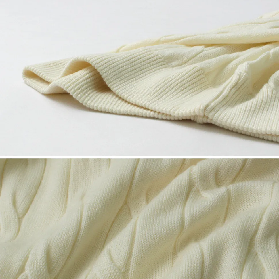 The knitting pattern features flat cable knitting that evokes an American traditional style, resulting in a refined piece that easily blends with various outfits.