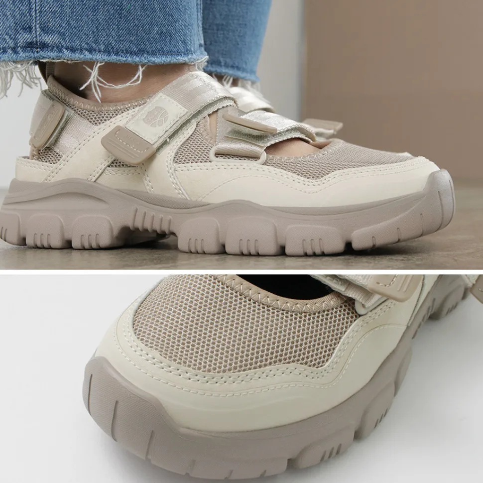 The upper is made of breathable mesh material. The Velcro adjuster, which allows you to freely adjust the fit, not only looks unique, but also holds the instep firmly in place and provides a stable and comfortable fit.