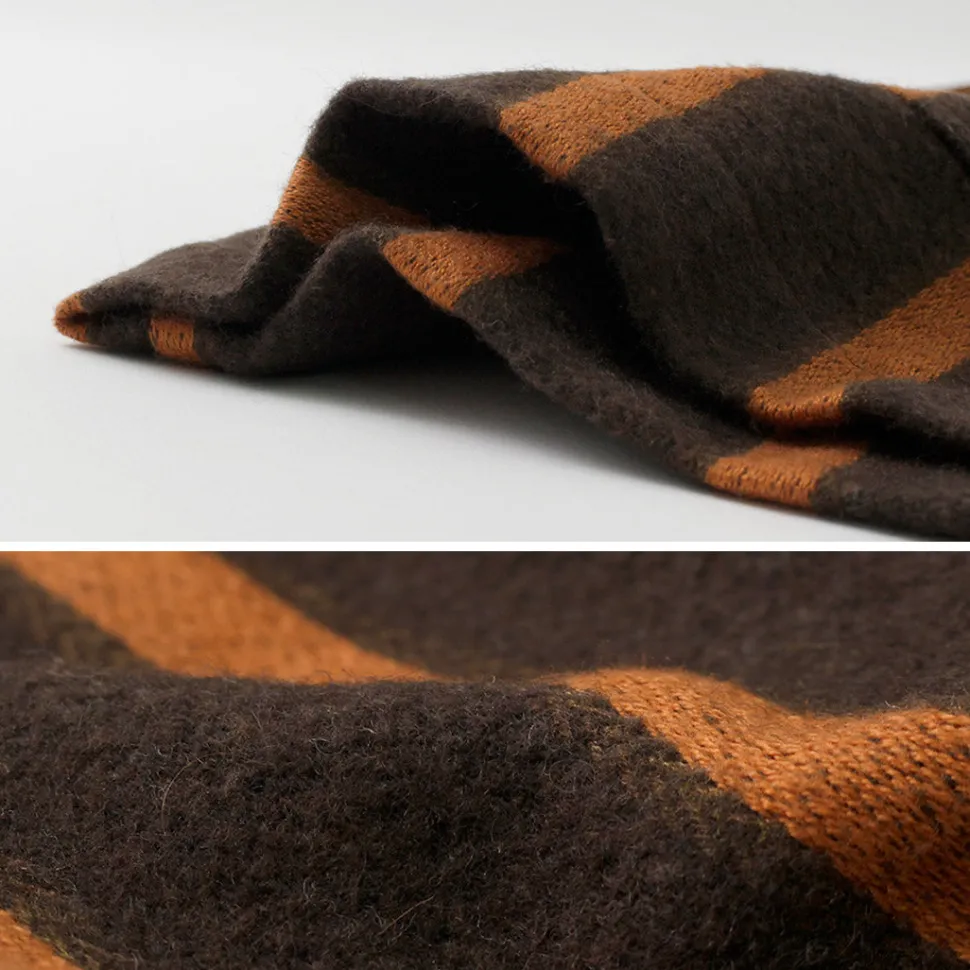 This item is made of 100% wool fabric featuring club stripes in a retro color scheme that evokes a sense of nostalgia. The fabric is slightly brushed like a flannel, giving it the warmth that only wool can provide.
