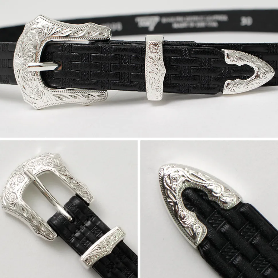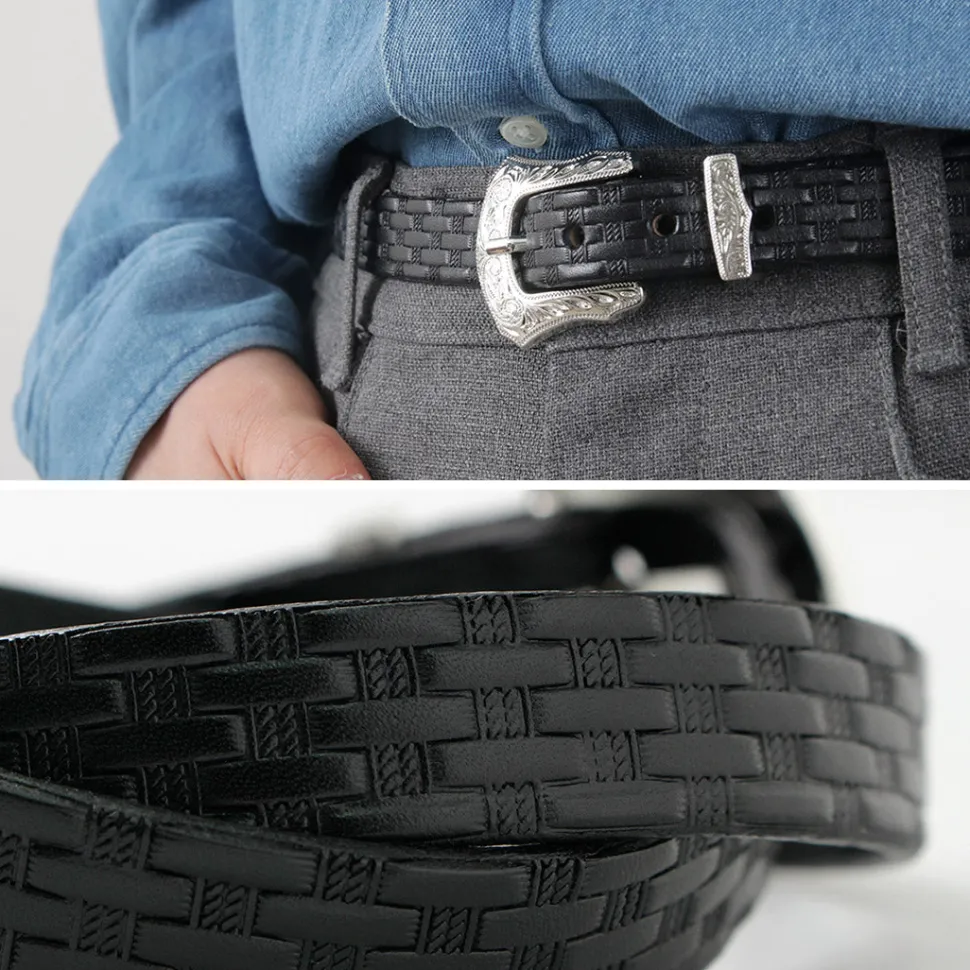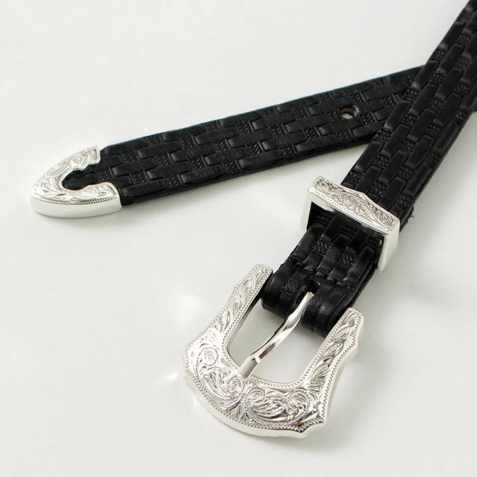 Adopts a Western-style decorative design for the buckle. Features intricate engraving on metal parts such as loops and tips, along with sturdy construction.