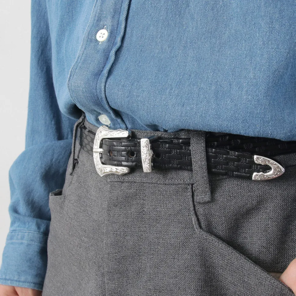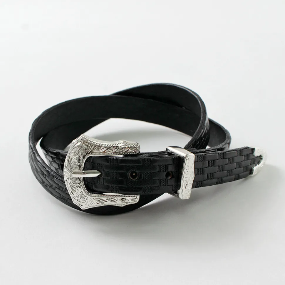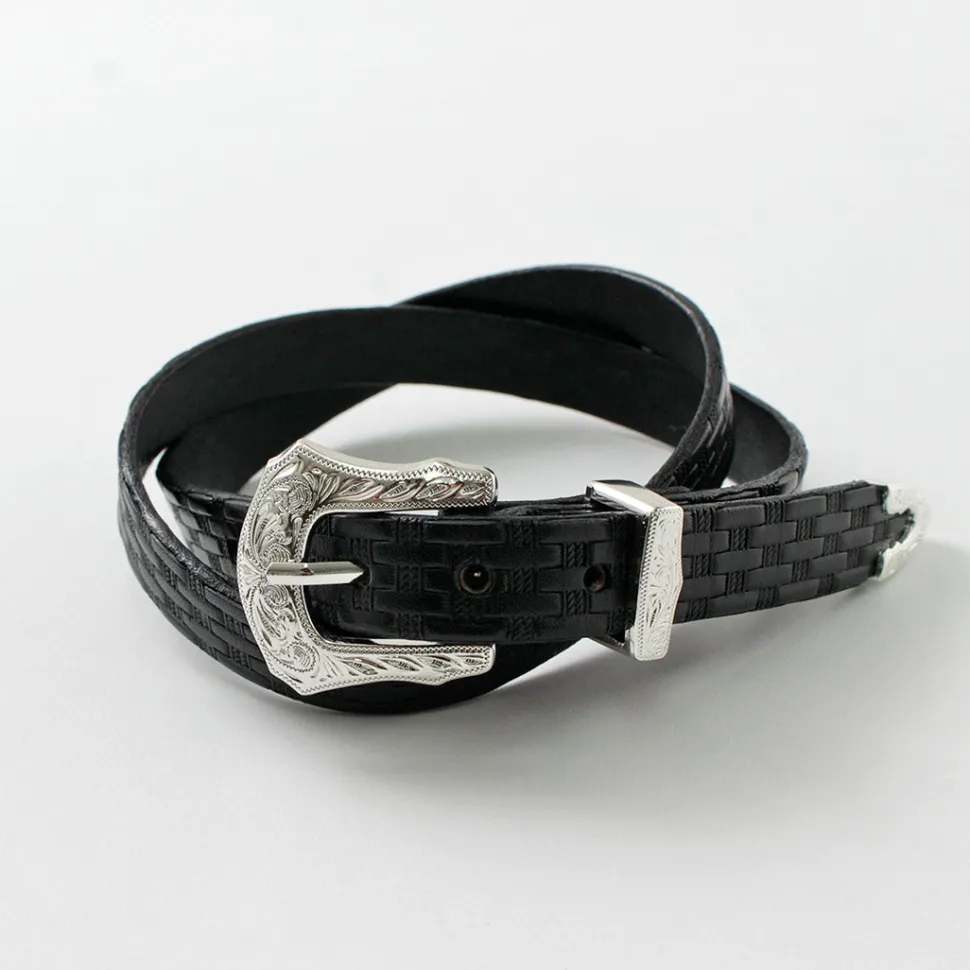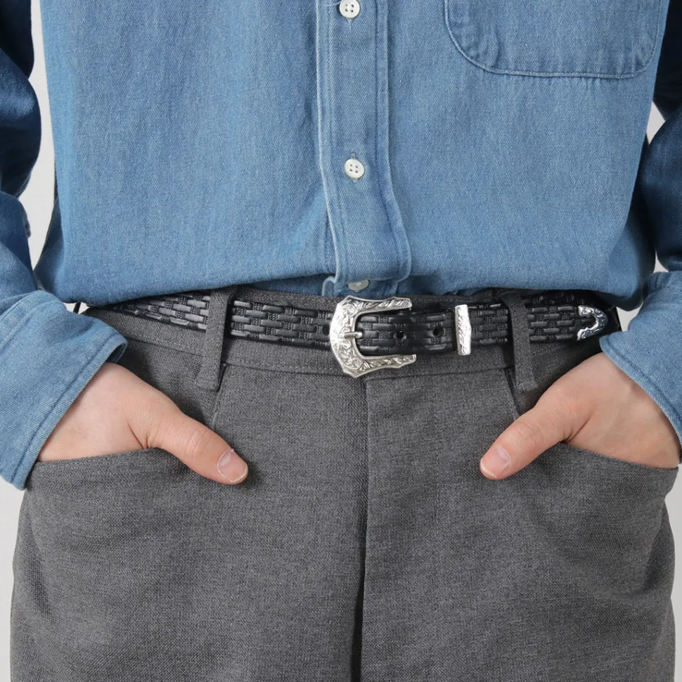 Adopts a Western-style decorative design for the buckle. Features intricate engraving on metal parts such as loops and tips, along with sturdy construction.