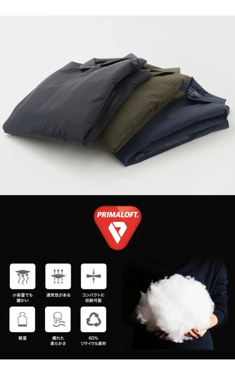 PrimaLoft is very thin and lightweight. While providing a firm warmth, it realizes a slim and beautiful silhouette without the bulkiness of down. Also, it is surprisingly lightweight at about 500g even though it is a coat. You will be surprised at how light it feels when you put it on.