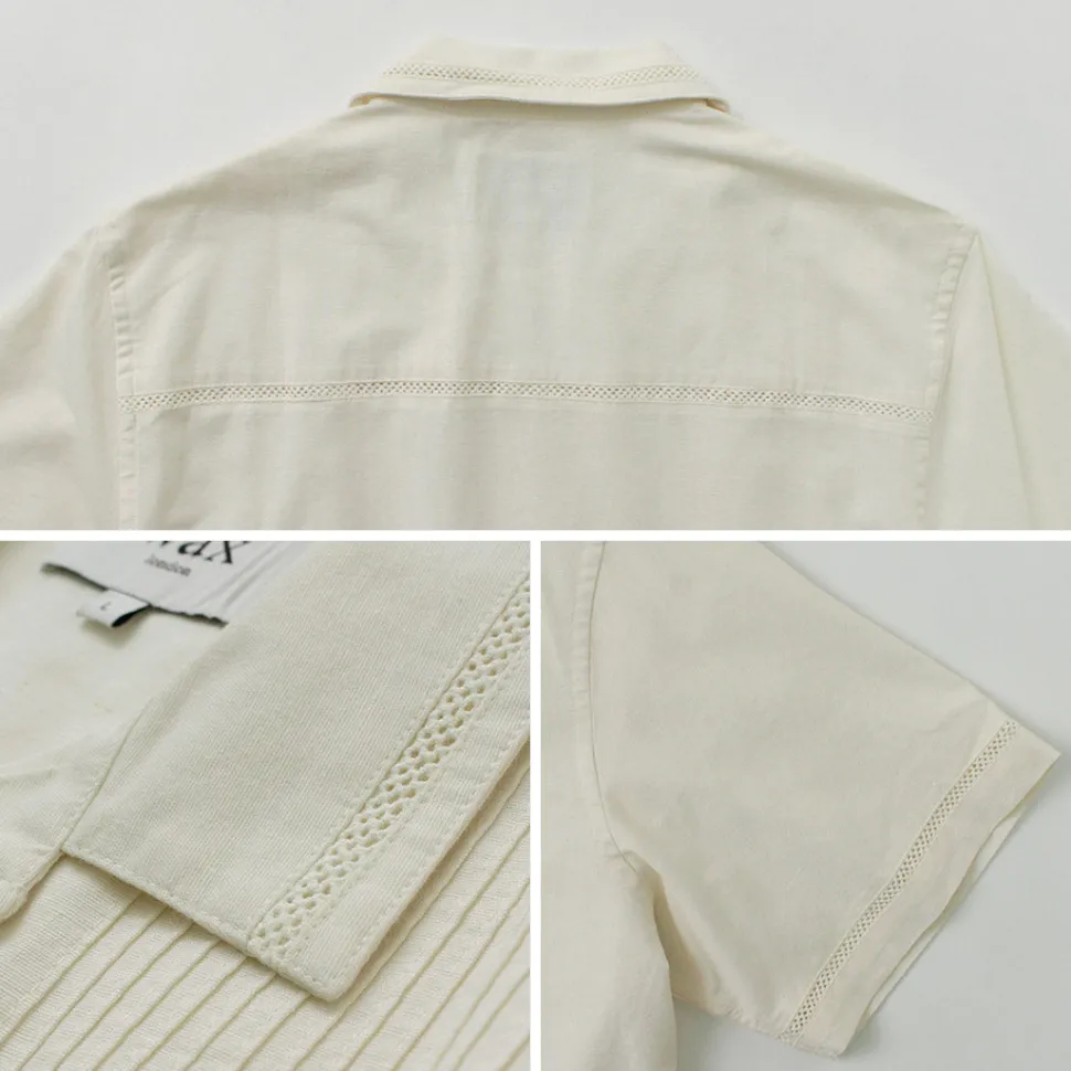 This open-collared shirt is eye-catching for its clean, clean-cut, crocheted texture and beautifully aligned pin-tucks at the front.