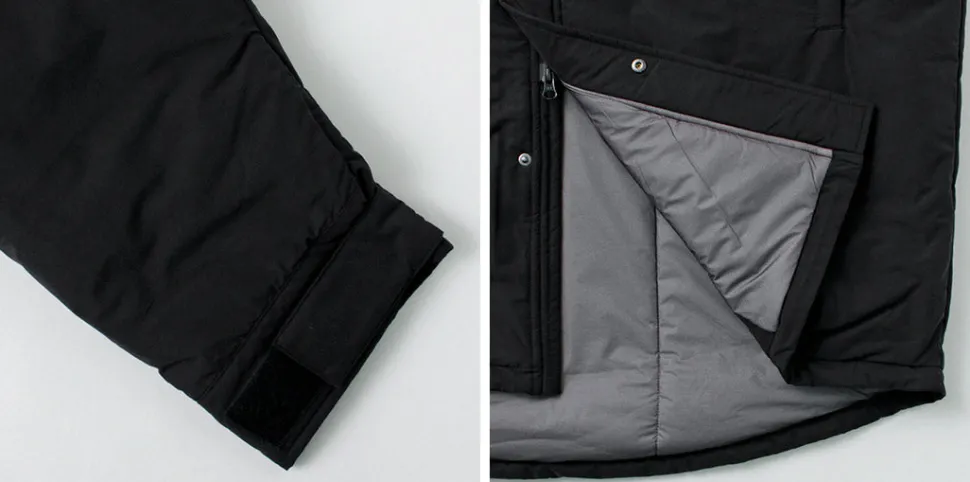 Adjustable cuffs with velcro straps to block cold winds.